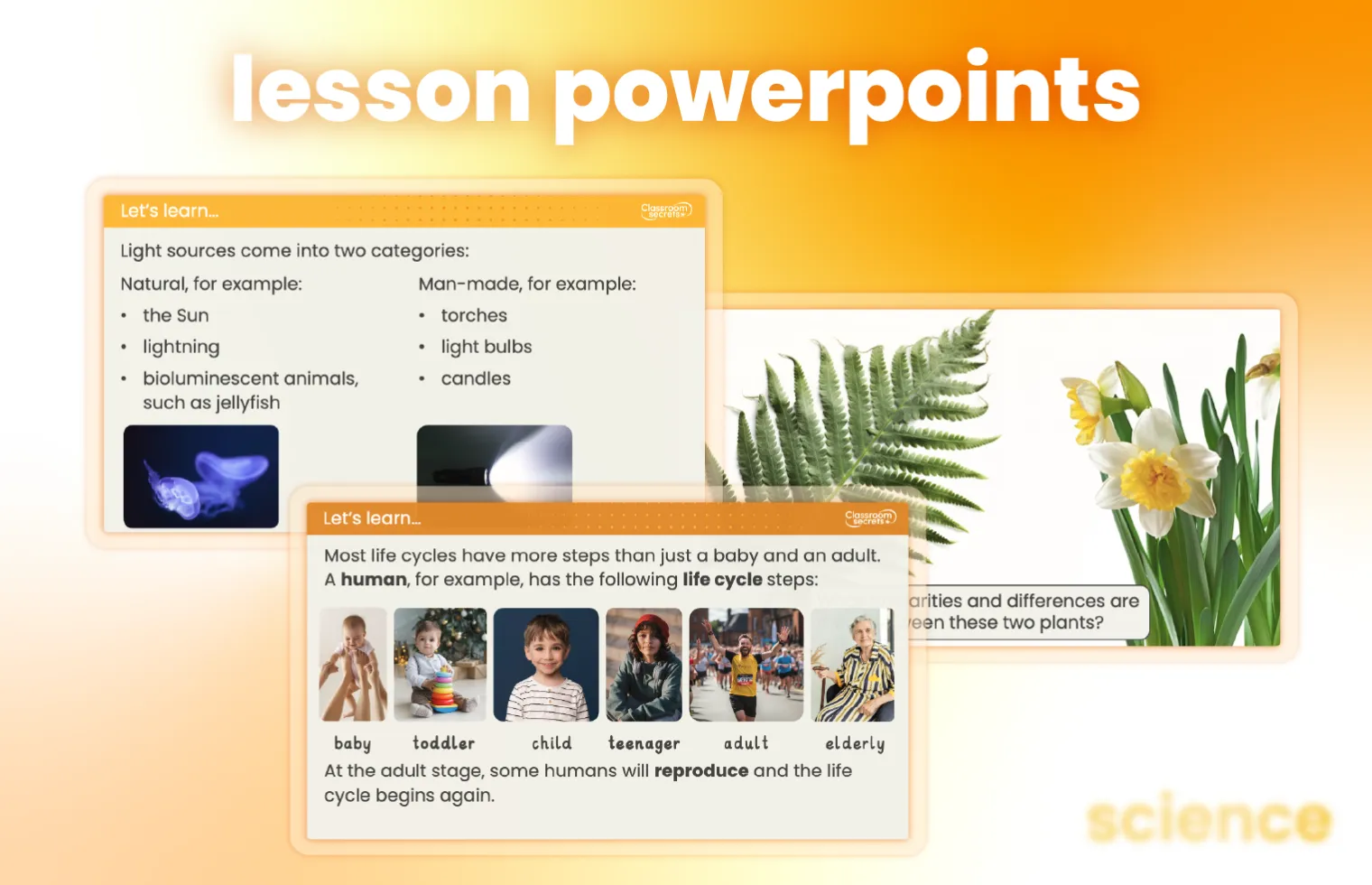 We have everything you need to teach science across the whole school. Our full science scheme includes planning, lesson resources, display packs, assessments and more. To get you started choose the first PowerPoint for lesson 1. Simply create a free user account.